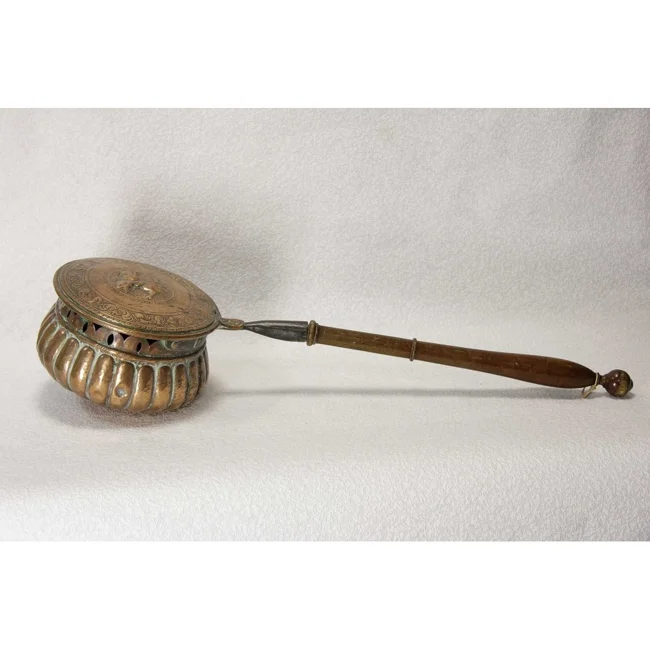 A copper bed warmer. In Europe, especially Northern Europe, it was not customary to go to bed in a cold bed.