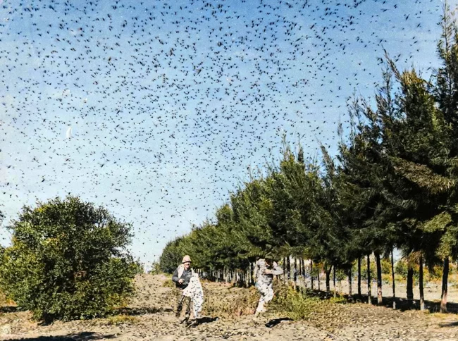 Israeli farmers try to repel a swarm of locusts with a sheet and brushwood on an Israeli farm in the 1930s.