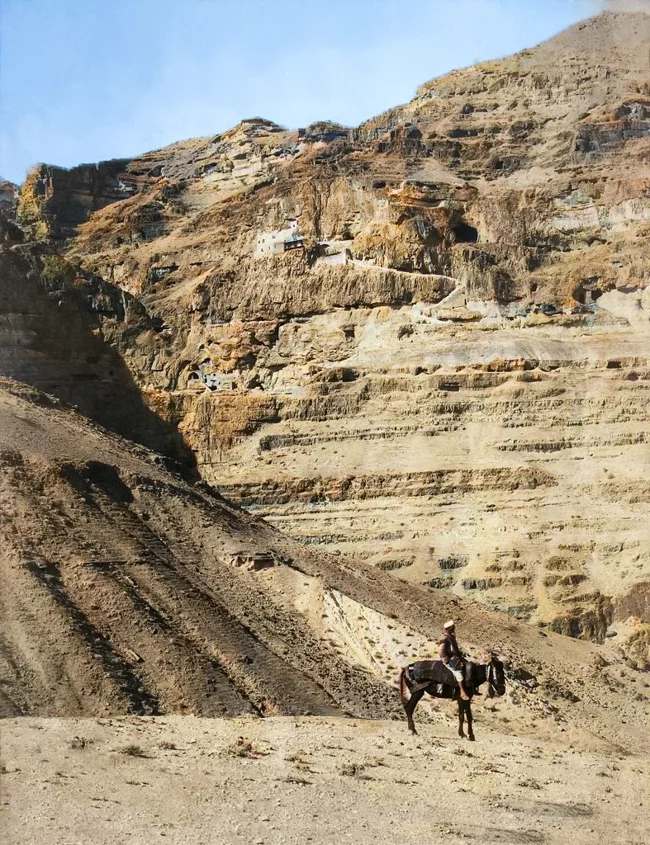 A man on a donkey near the Mount of Temptation, near Jerusalem.