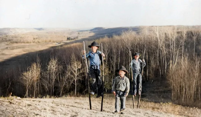 Boys playing on stilts. Alberta, Canada, 1944. ![]()