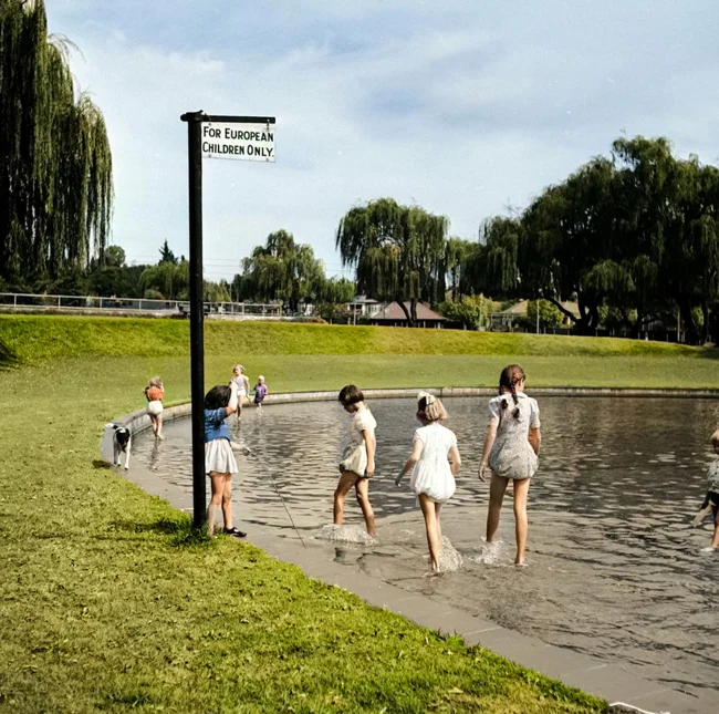 White children splash in a pond with a sign that says "For European Children Only." South Africa, 1956.