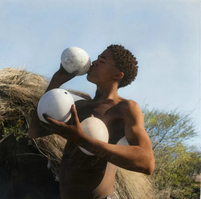 A Khoekhoe boy drinks from ostrich eggshells used as bottles in the Kalahari Desert. Namibia, 1955.