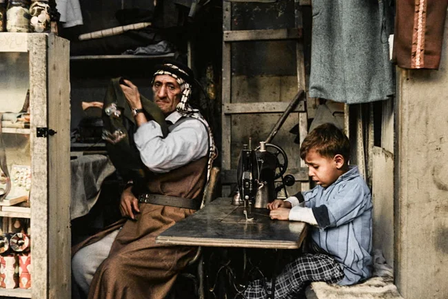 A boy helps adults in their family business sewing clothes in Baghdad, Iraq, 1963.