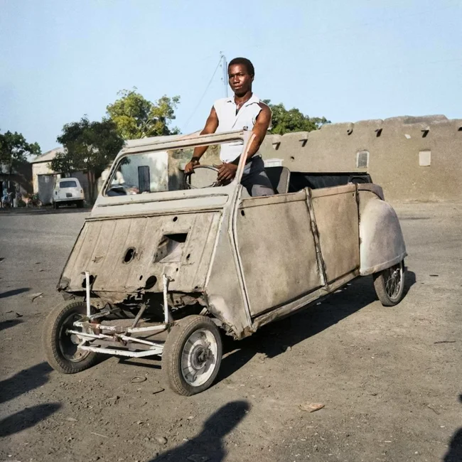 A young man in his Citroen 2CV Bricolee, Bobo-Dioulasso, Burkina Faso, 1968.