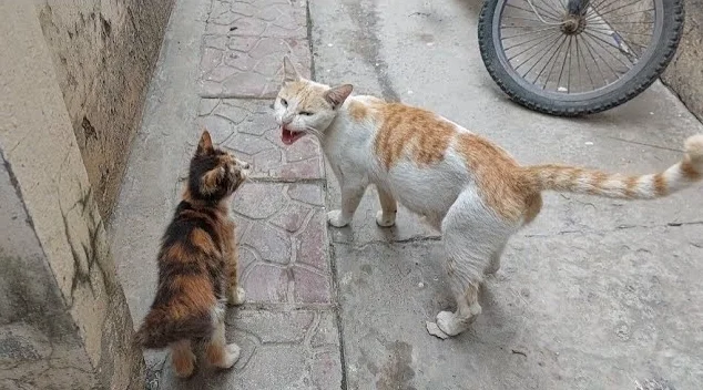 A cat with a kitten begging for food on a street in Jakarta