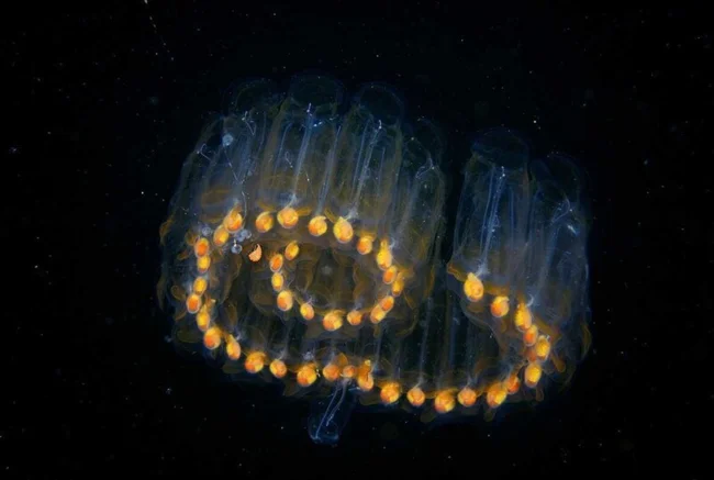 However, the most interesting fact about salps is their unique reproduction. They can reproduce both asexually and sexually, creating entire chains of offspring. The asexual generation forms long colonies, where each individual is connected to its neighbors, resembling a living train. When the time comes for sexual reproduction, salps release eggs, from which new forms emerge, ready to begin the cycle anew. The combination of sexual and asexual reproduction through alternation of generations is probably associated with high mortality from numerous enemies.