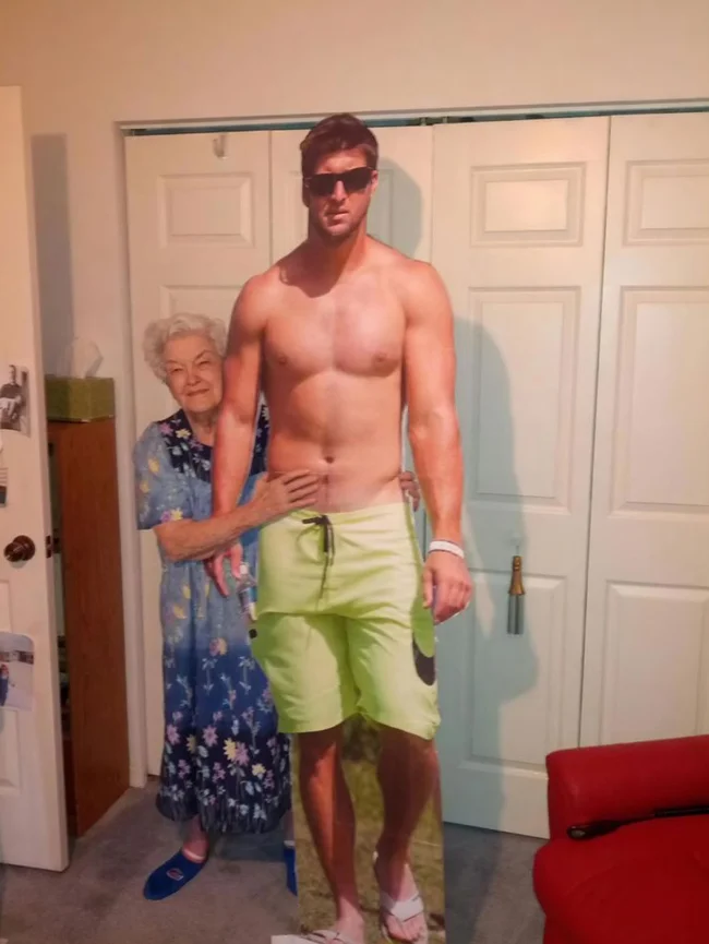 Grandma is a fan of football player Tim Tebow, that's why she got such a birthday present ![]()
