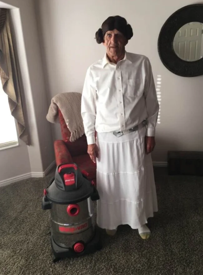 Grandpa in a Princess Leia costume with R2D2 nearby