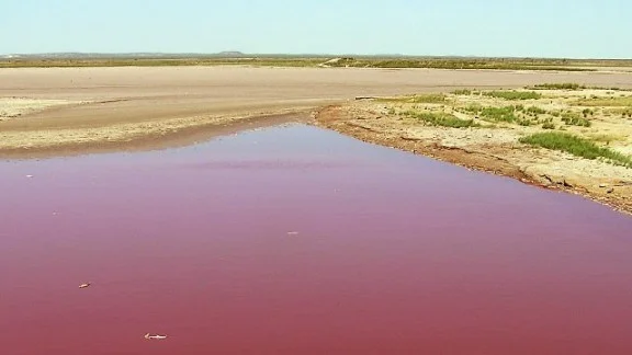 Microorganisms and salinity of the water. The red color of the water is caused by the presence of specialized microorganisms such as Dunaliella salina (green algae) and Chromatiaceae bacteria, a genus of purple bacteria that thrive in oxygen-poor water. They are often found in stagnant water. These organisms secrete red pigments that protect them from the intense sunlight typical of the Texas climate.