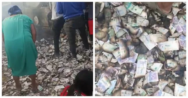 Surreal footage shows locals rummaging through piles of burnt banknotes on the ground, looking for usable ones.
