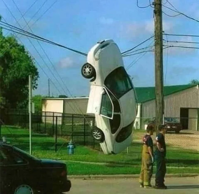 The only thing more interesting than the car tangled in the electrical wires are these two. What's going on behind the scenes, and why did it capture all their attention?