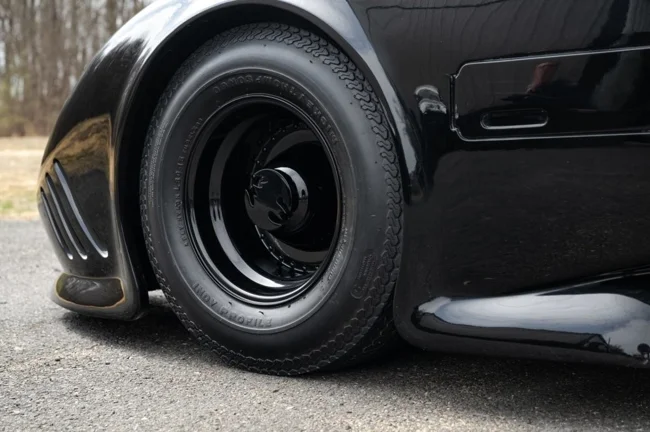 The Batmobile is based on the Chevrolet Impala chassis, which the creators from the Wounded Knee Motors studio extended to almost 6 meters and equipped with hydraulic suspension. The car is powered by a 5.7-liter V8 from Chevy, aggregated with an automatic transmission. All torque is transmitted to the rear wheels, which are wrapped in meaty Mickey Thompson tires measuring 255/80 R15.