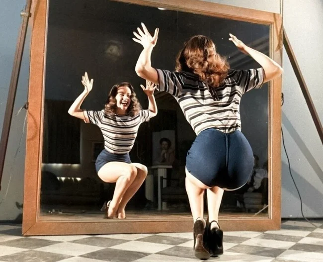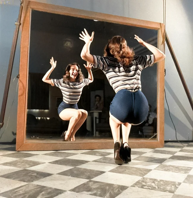 American dancer Betty Dierenger rehearsing in front of a mirror, 1947.