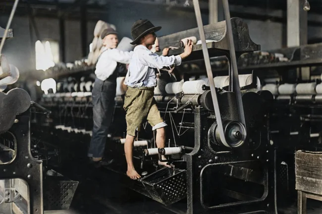 Two boys repairing a loom or fixing broken threads. Georgia, USA, 1909. Many families lived in poverty, especially in rural or working class areas. The income of one parent (usually the father) was not enough to support the family, so children were forced to work to help make ends meet. Children often worked in factories, mines, farms, or as paperboys, apprentices, and helpers.