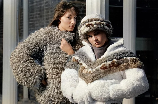 "Fashion Sweaters." USA, 1983. Fashion forecasters have dubbed 1983 "the year of the sweater," and designers have responded with creations featuring animal prints and spots, ruffles and pearls, as well as checks and diamonds.