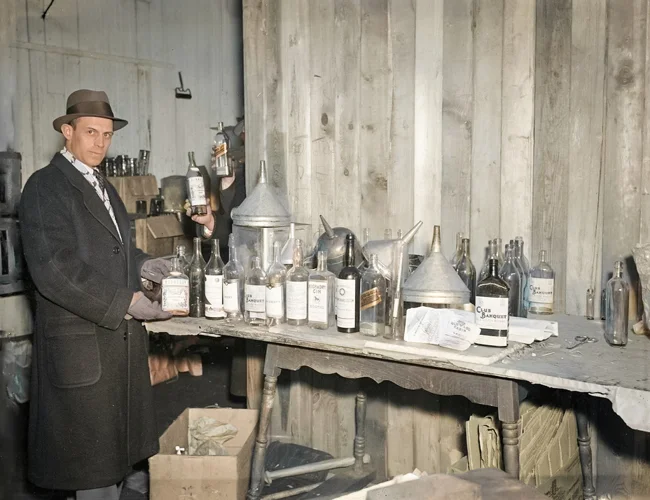 Underground "alcohol factory". USA, 1930s. A striking example of how the illegal alcohol production and sale industry flourished in the USA during the "Prohibition" (1920-1933). Despite the ban, alcohol consumption remained popular. Many citizens did not want to give up drinking, which created a huge market for illegal production. The production and sale of alcohol became extremely profitable. Underground factories could operate with minimal costs, and alcohol was sold at inflated prices through illegal channels.