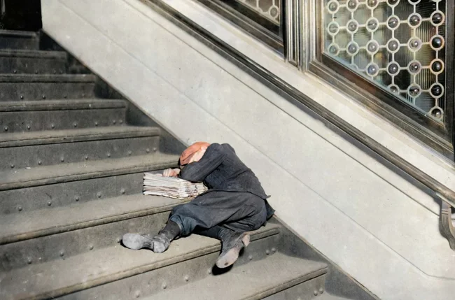 A young paperboy sleeps on the job. USA, 1912.