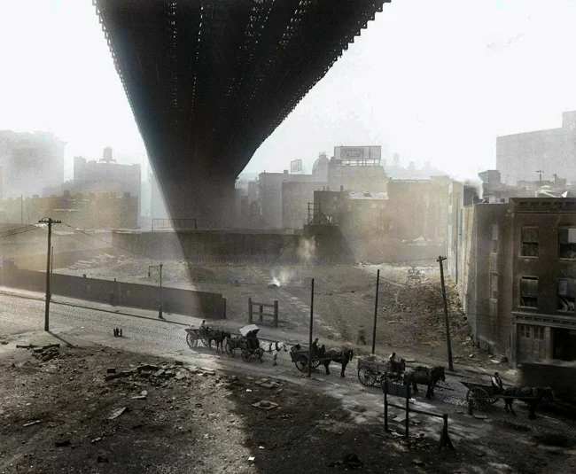 Brooklyn Bridge and horse-drawn carriages. USA, 1918.