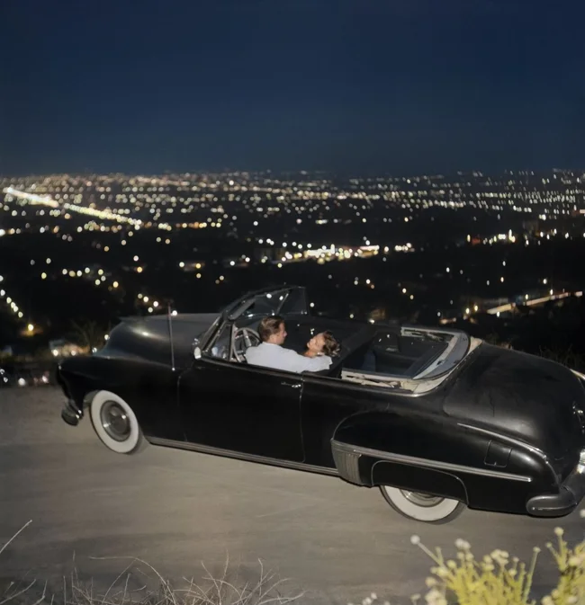 A couple embraces in a convertible overlooking Los Angeles. California, Hollywood. USA, 1951.