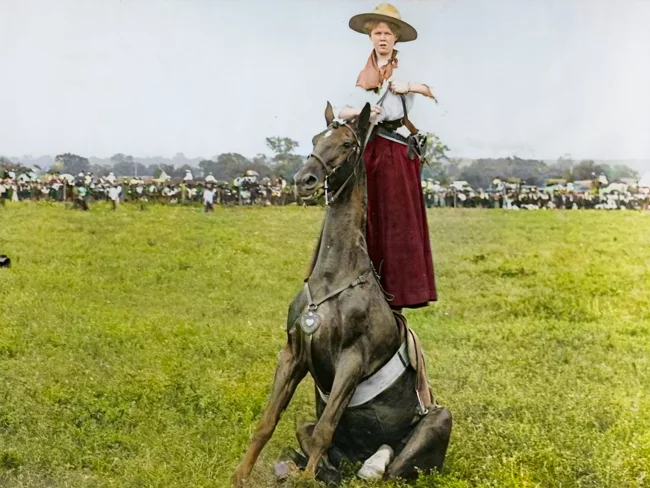 Lucille Mullhall on a ranch in Oklahoma, 1909. Born and raised on a ranch in Oklahoma, Lucille Mullhall made history as one of the pioneers among women who dared to compete with men in the art of horsemanship. She won many honorary titles, including "Rodeo Queen" and "Queen of the Western Prairie." She began her career in her father's rodeo show, the Mullhall Wild West, in 1899. Lucille not only competed in various rodeo shows, but also created her own in 1916. For her outstanding achievements, she was inducted into the National Cowboy & Western Heritage Museum, the Rodeo Hall of Fame, and the National Cowgirl Museum and Hall of Fame, cementing her status as a legend of the American West.