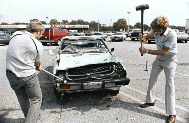 A charity attraction in 1982. The event was aimed at raising funds for families affected by the massive "temporary" layoffs in the American auto industry. Spectators paid $1 for each hit to a car, which helped draw public attention to the pressing social issues of the period. In the 1970s and early 1980s, the American auto industry faced a crisis due to the growing popularity of Japanese cars. Their success was explained by their affordable price, economy, reliability and high build quality, which was especially appreciated in the context of the energy crisis and rising fuel prices. At the same time, American manufacturers focused on producing powerful but gas-guzzling cars were vulnerable. The crisis led to mass layoffs of workers, protests (including the symbolic destruction of Japanese cars) and demands to limit imports. In 1981, the United States and Japan agreed on quotas for the export of Japanese cars. American companies were forced to reconsider their strategy: they began to produce more economical models and cooperate with Japanese brands, which began to open factories in the United States. This crisis became a lesson for the American industry, emphasizing the importance of adapting to market changes and consumer demands.