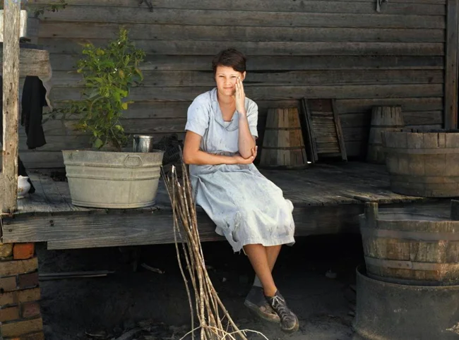A farmer's daughter sitting on the porch. Wolf Creek Farm, Georgia, USA, 1935.