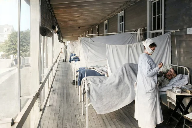 A ward of Walter Reed Hospital, 1918. A photograph of Walter Reed Hospital in Washington, D.C., during the 1918–1919 influenza pandemic, known as the Spanish flu. The photograph shows rows of beds set up on an open terrace, with patients separated from each other by sheets suspended between them.