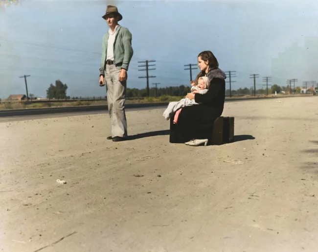 A young family, penniless, hitchhikes on US 99, California. In early 1935, the twenty-four-year-old father and seventeen-year-old mother arrived in California from Winston-Salem, North Carolina. Their child was born in the Imperial Valley, where the couple earned their living as field laborers.