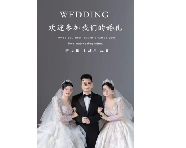 A person claiming to know the man said that one of the brides is his ex-wife and the other is his current girlfriend. He added that the three-way wedding was approved by all three families. Since bigamy is illegal in the country, the police immediately took an interest in the case and conducted an investigation. Officers at the Bijie police station confirmed that one of the two women was indeed the man's ex-wife. The officers claimed that the wedding photo and invitation were part of a prank. And the police themselves FORCED the trio to cancel their already planned wedding ceremony.