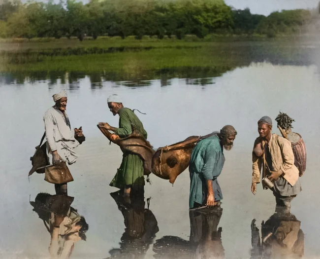 Water carriers were workers who, for money, delivered water from the Nile, public wells or fountains to the homes of city dwellers. It was hard, but extremely necessary work. Water was carried in large leather bags made from whole animal skins (usually sheep or goats), hermetically sewn. These bags were called "mashk". The water carrier carried such a bag on his back or shoulders, sometimes donkeys or small carts were used to deliver larger volumes of water to more remote areas. The price of water depended on the distance, the quality of the water and the season (demand increased in summer).