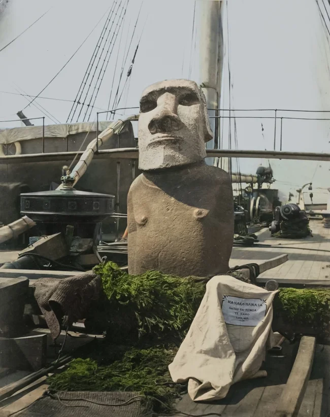 A statue from Easter Island on board an English ship, during transportation to England, 1868.
