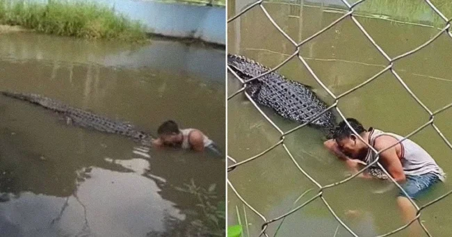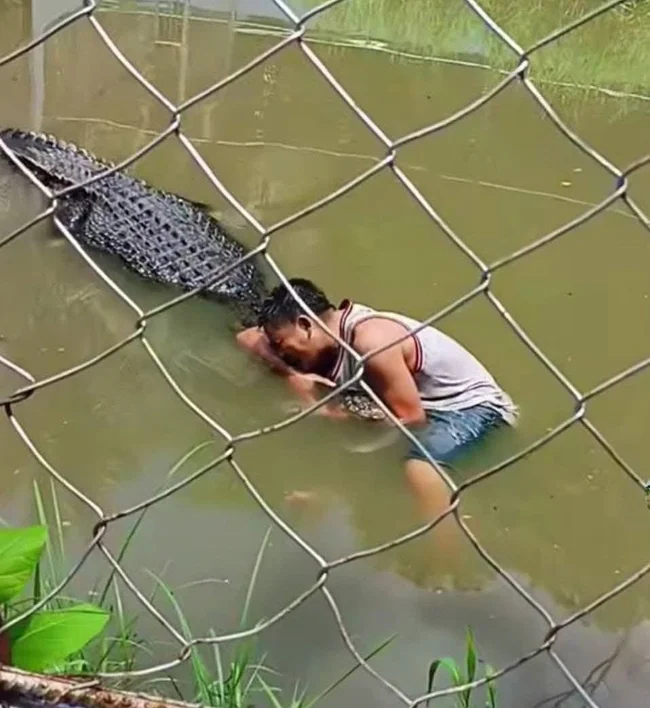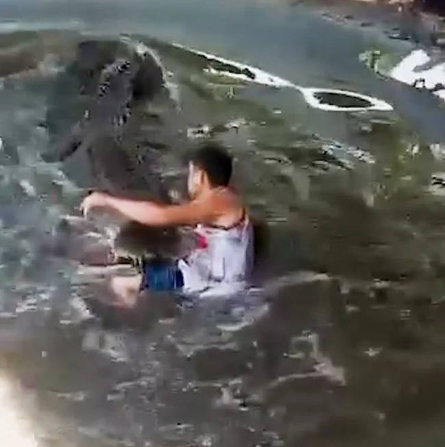 Terrified onlookers screamed at him to leave. The enraged female crocodile lunged at the intruder and sank her fangs into his arm.