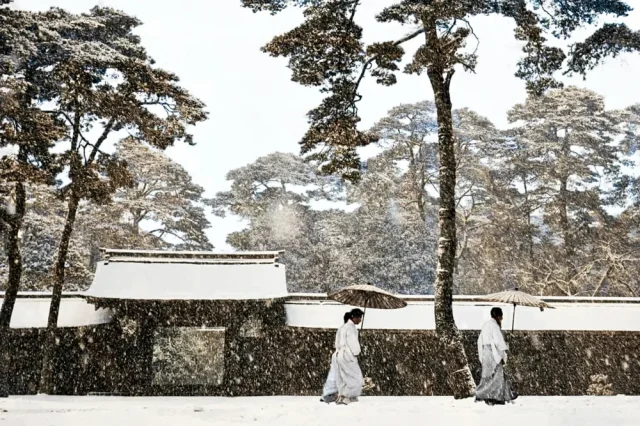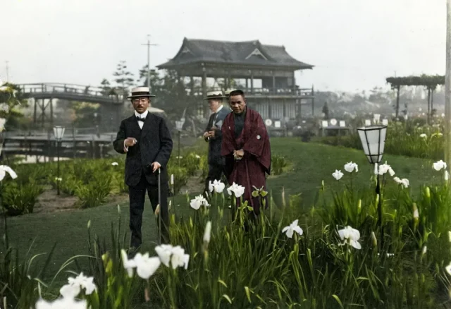 Shinto priests in the garden of the Meiji Shrine. Tokyo, 1951.
