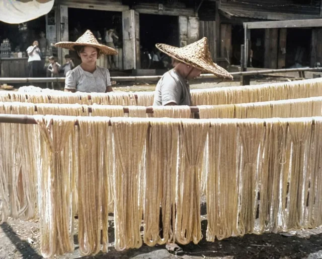 Chinese dyers hang cotton fabrics in courtyards. Bangkok, 1950.