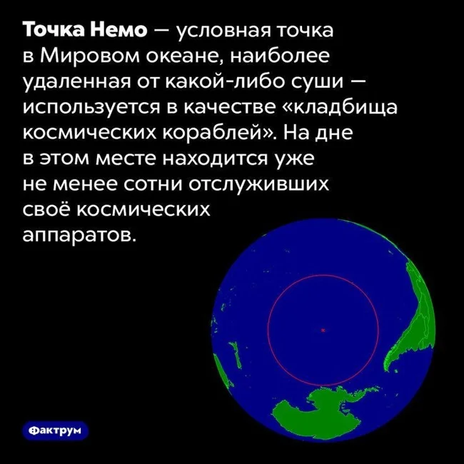 Point Nemo is considered the farthest place on the planet from the coast. The nearest piece of land is more than 2,500 km away. It is called a point rather conditionally, in fact it is a site that occupies about 37 million m².