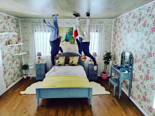 The house, literally "standing on the roof", creates the effect of gravitational chaos: furniture, stairs and even the fireplace are fixed upside down, making visitors feel like heroes of a surreal world.