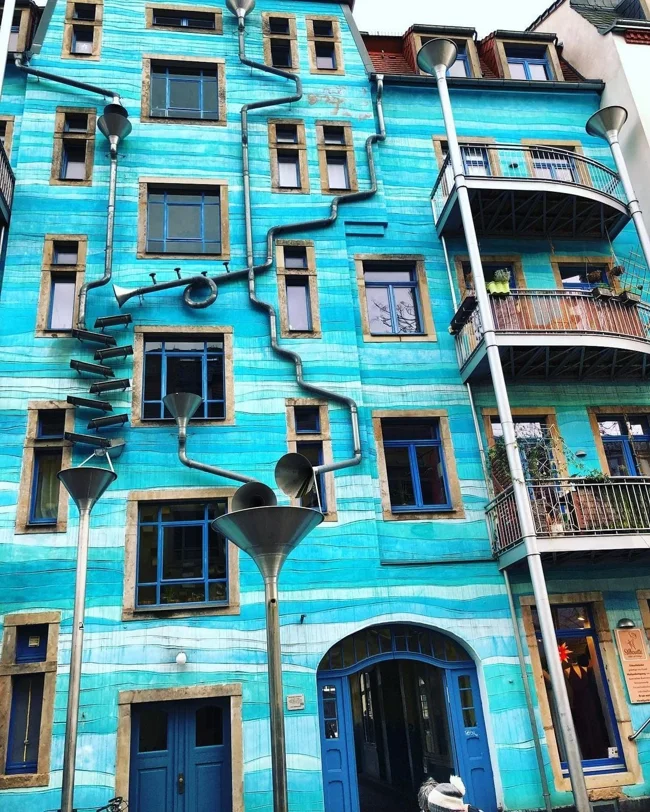 It would be more correct to call the Sound House the House of Singing Rain, since it was conceived as an art installation that unites nature, architecture, and music. There is a house in Dresden where rain becomes a composer and performer. Its facade is decorated with a network of gutters and downpipes, designed to create melodic overflows during rain, reminiscent of playing a xylophone.