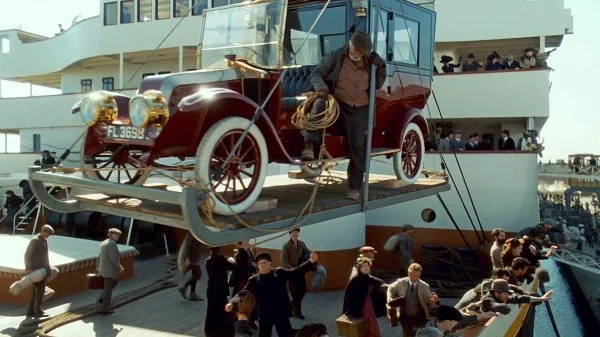Loading a Renault onto the Titanic (a still from a 1997 film, in reality it was loaded disassembled and packed into a crate);