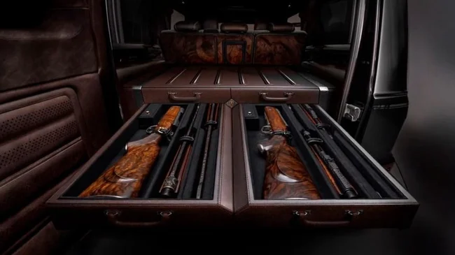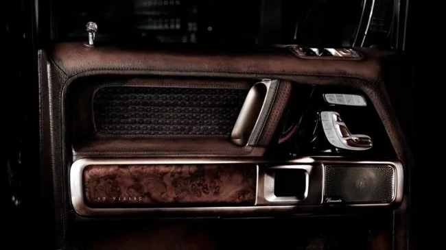 The interior of the Gelendvagen is re-upholstered with exclusive leather, which was processed and patinated by hand specifically for the G-Viking. The original inserts on the seats and the central tunnel are made of seal skin, which should be another reference to northern cultural features. The SUV has lost about half of its trunk. The boxes for hunting rifles are formed here, which also contain tools for their care.