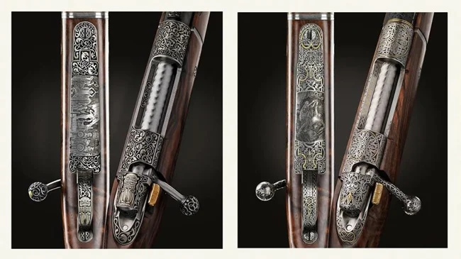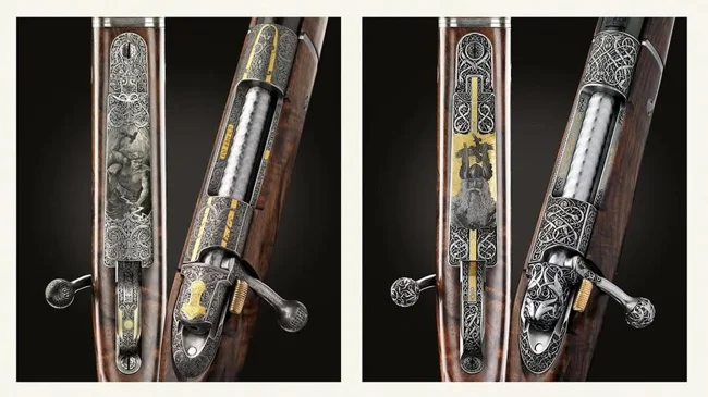 Each of the rifles received a unique finish, partly made of gold, and its own name. Three were named after the gods Odin, Thor and Loki, the name of the fourth - Midvinterblot - ("Midwinter Sacrifice") refers to the painting by the artist Carl Larsson from the National Museum of Stockholm, which depicts the ancient legend of King Domald. It is considered one of the most controversial paintings in Sweden.