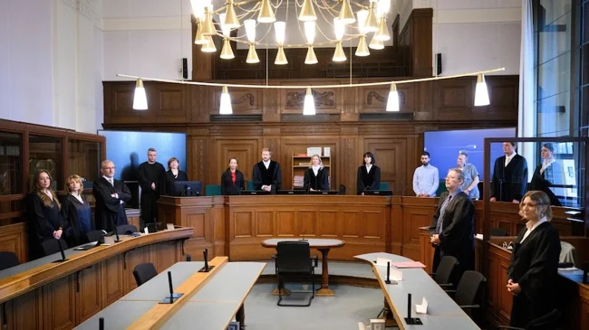 Judge Sylvia Busch (center) with the prosecution and defense attorneys on the first day of the trial of Johannes M.