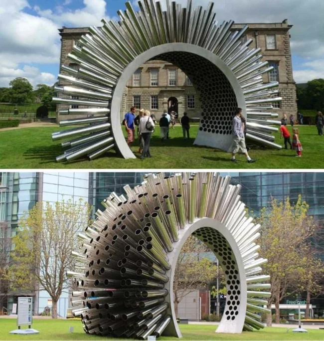 «Aeolus» consists of 310 stainless steel pipes of various lengths. They are fixed on an arch, which is made in the form of a hemisphere. The instrument works without any power source at all, using only wind currents to reproduce sounds.