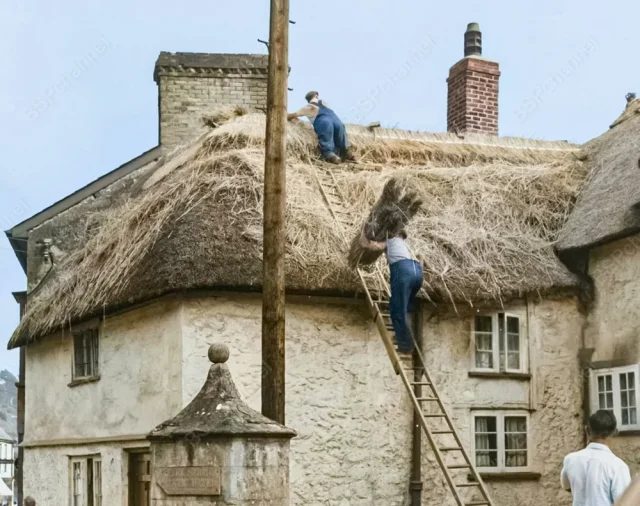 Workers lay thatched roofing. Devon, England, 1959.