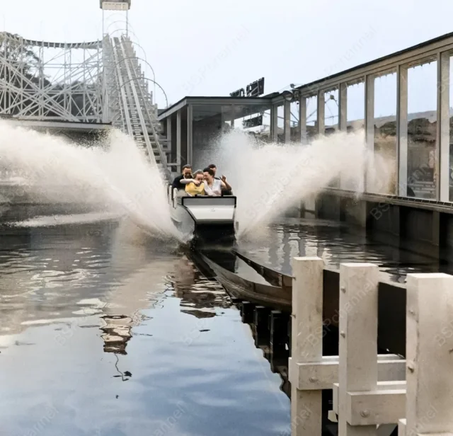 British actress Barbara Windsor and British drama school student Patricia Stark ride the Water Chute at the Battersea Festival Gardens fair. London, England, 1955.