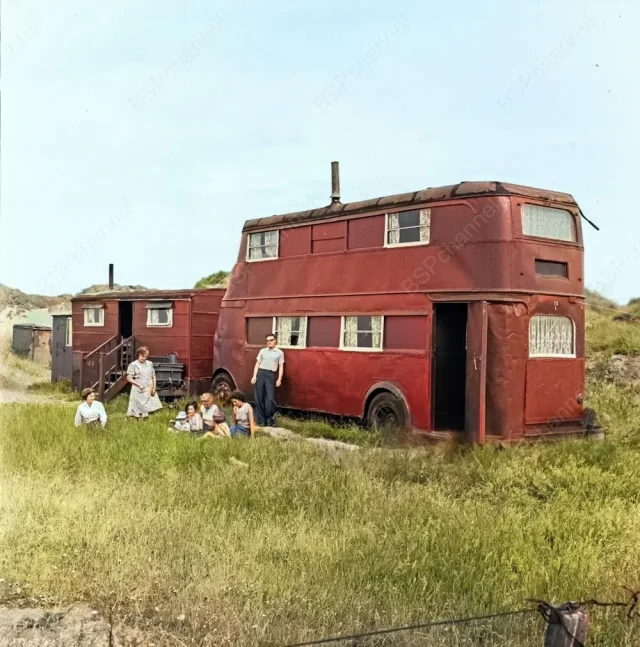 Dismantled buses and trolleybuses converted into accommodation on Talacre Beach, two miles from Prestatyn. Great Britain, 1959.