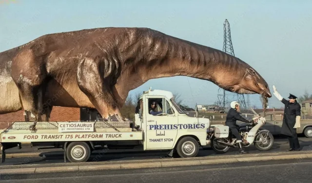 Dinosaur sculpture goes to Prehistoric Park. Scotland, 1973.