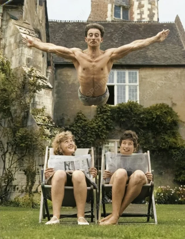 Bernard Cawthorne, a shipping surveyor from Hull, performs a "forward somersault" over the heads of two girls who are also attending a gymnastics course at Bisham Abbey in Berkshire. UK, 1959.