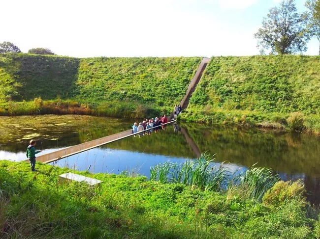 The bridge is 50 meters long (20 meters under water). The cost was €250,000. The bridge disappears into the landscape, preserving the historical appearance of the fort.