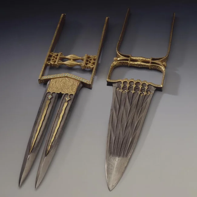 India, 18th century. An Indian dagger with an H-shaped handle, designed for stabbing. Often used as a ceremonial, hunting or combat weapon. A characteristic feature of the katar, as well as Indian weapons in general, is the decoration of the koftgari: the higher the status of the owner, the more complex and rich the decor used by the craftsmen: gold and silver inlay, cloisonné enamel, embossing.