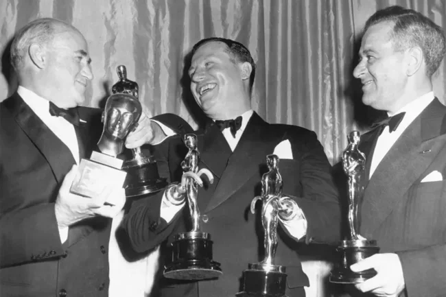 Harold Russell, center, with a special award and the Oscar for Best Supporting Actor, with Samuel Goldwyn (left) and The Best Years director William Wyler